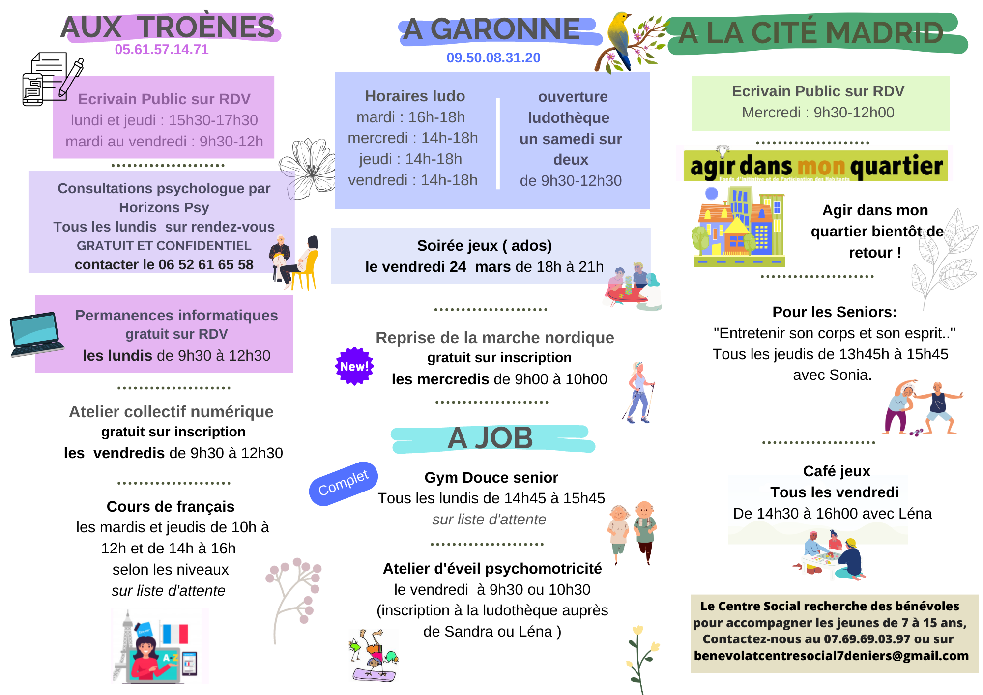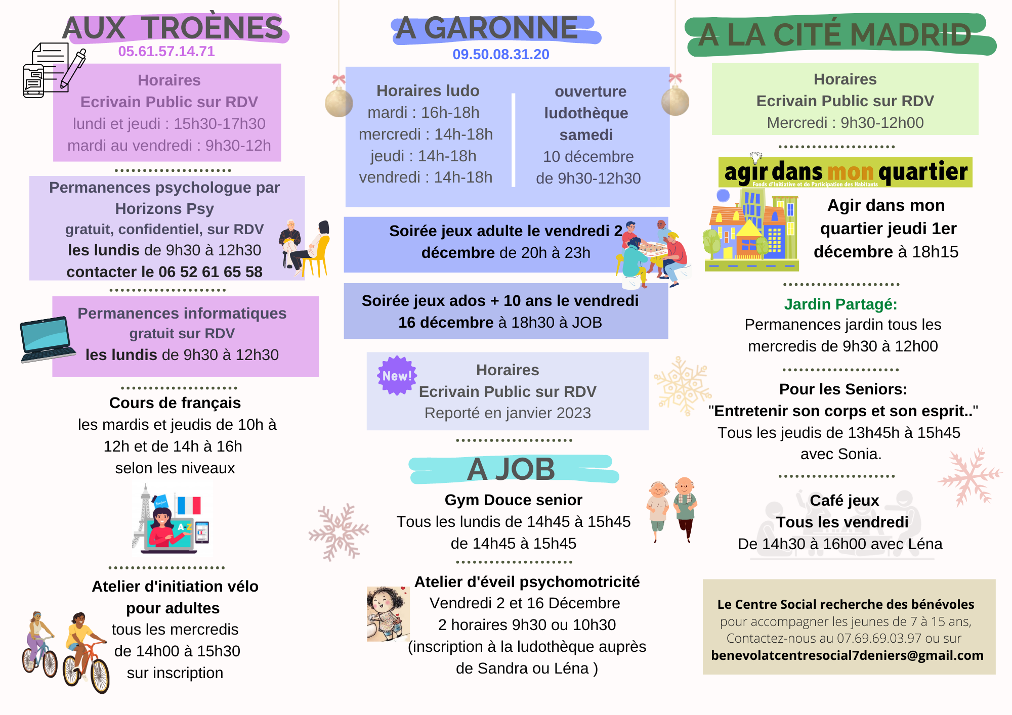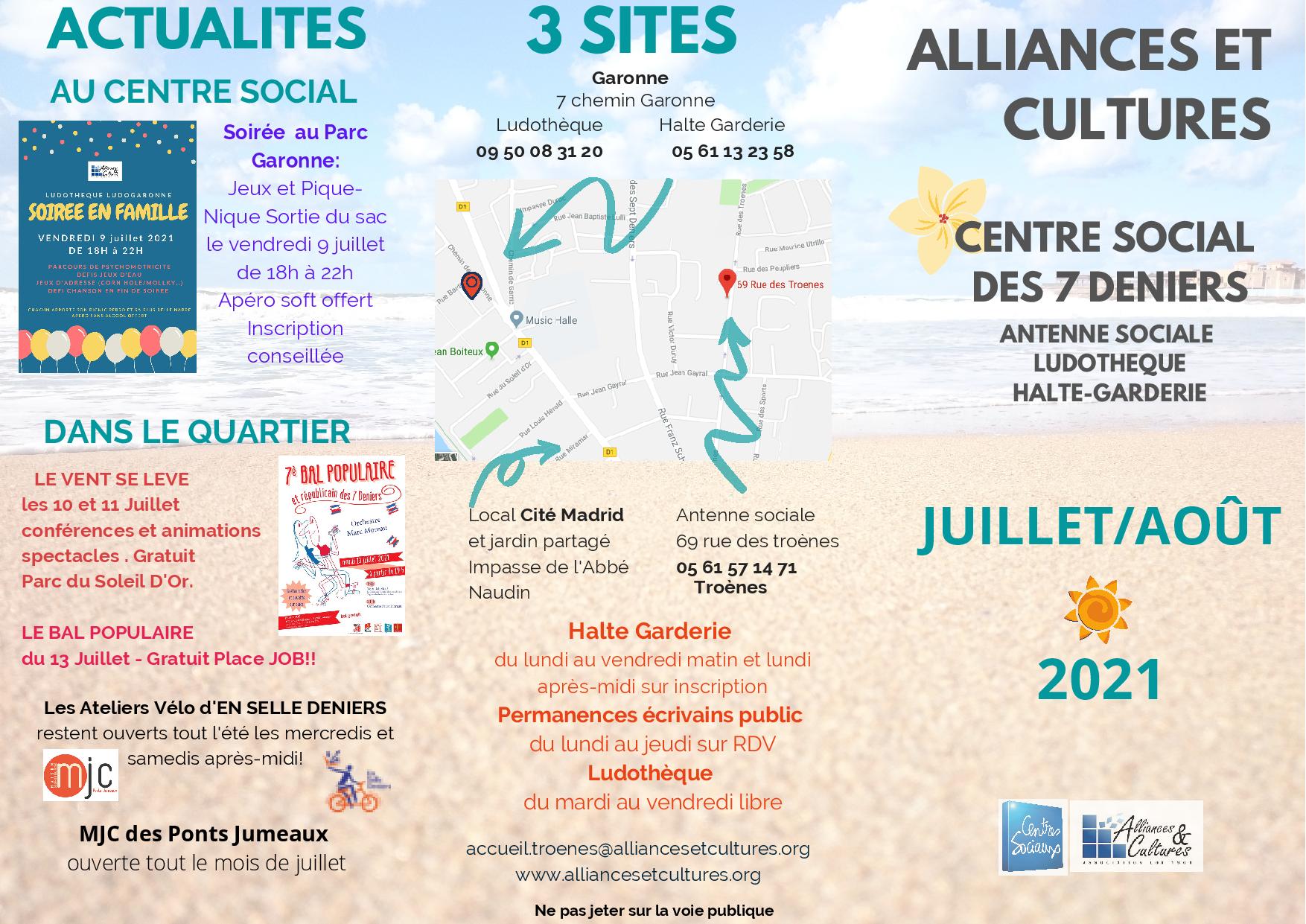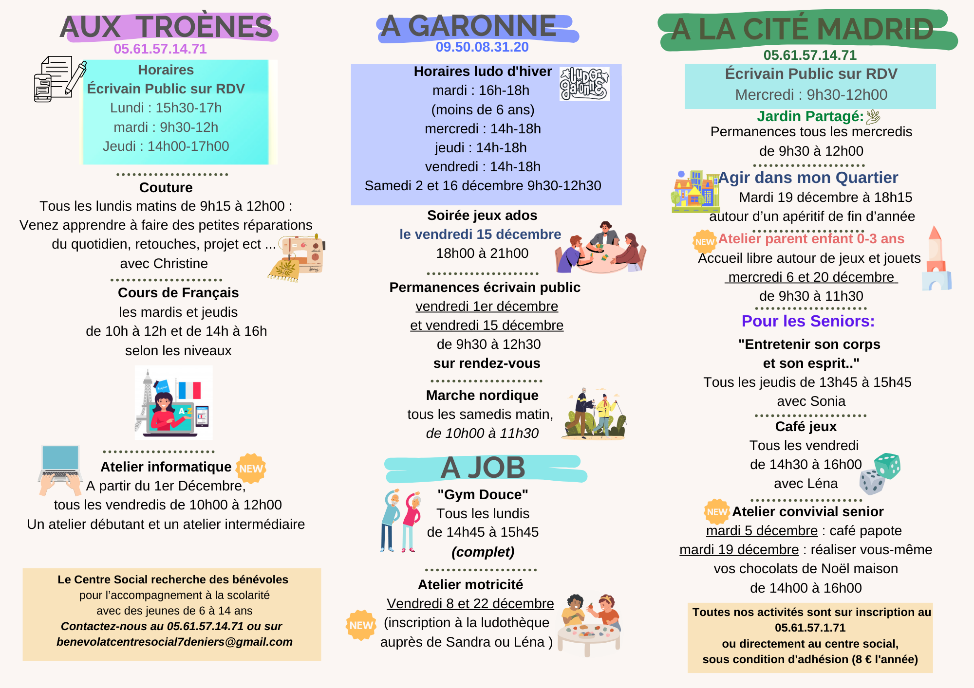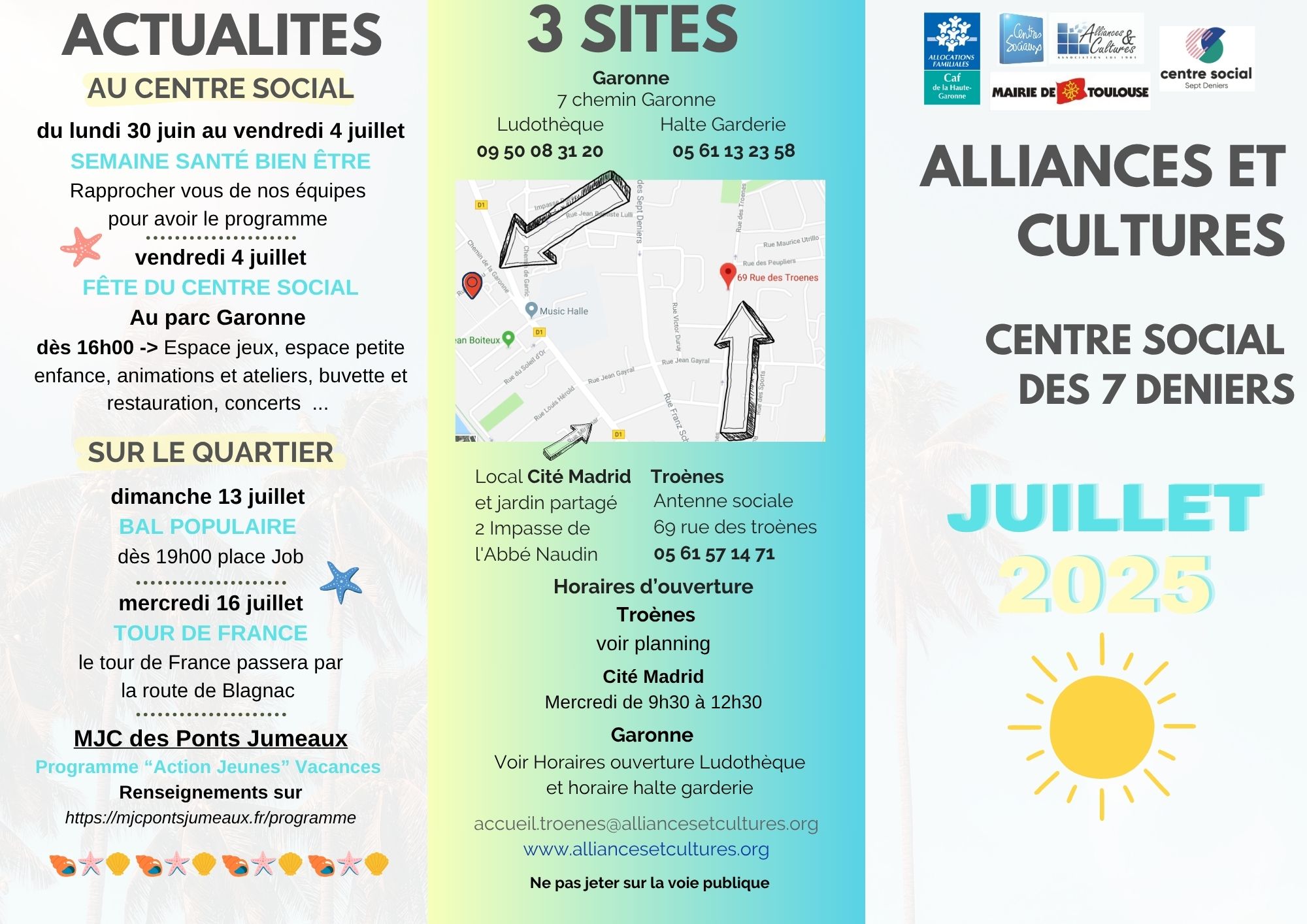 Téléchargez nos programmes d'activités ! Programme juillet 2025Programme ludo d'été 2025 De 3 mois à 17 ans En Famille Pour les adultes Vie de quartier Ludothèque Galerie photos Bienvenue au Centre Social des 7 Deniers Actualités
