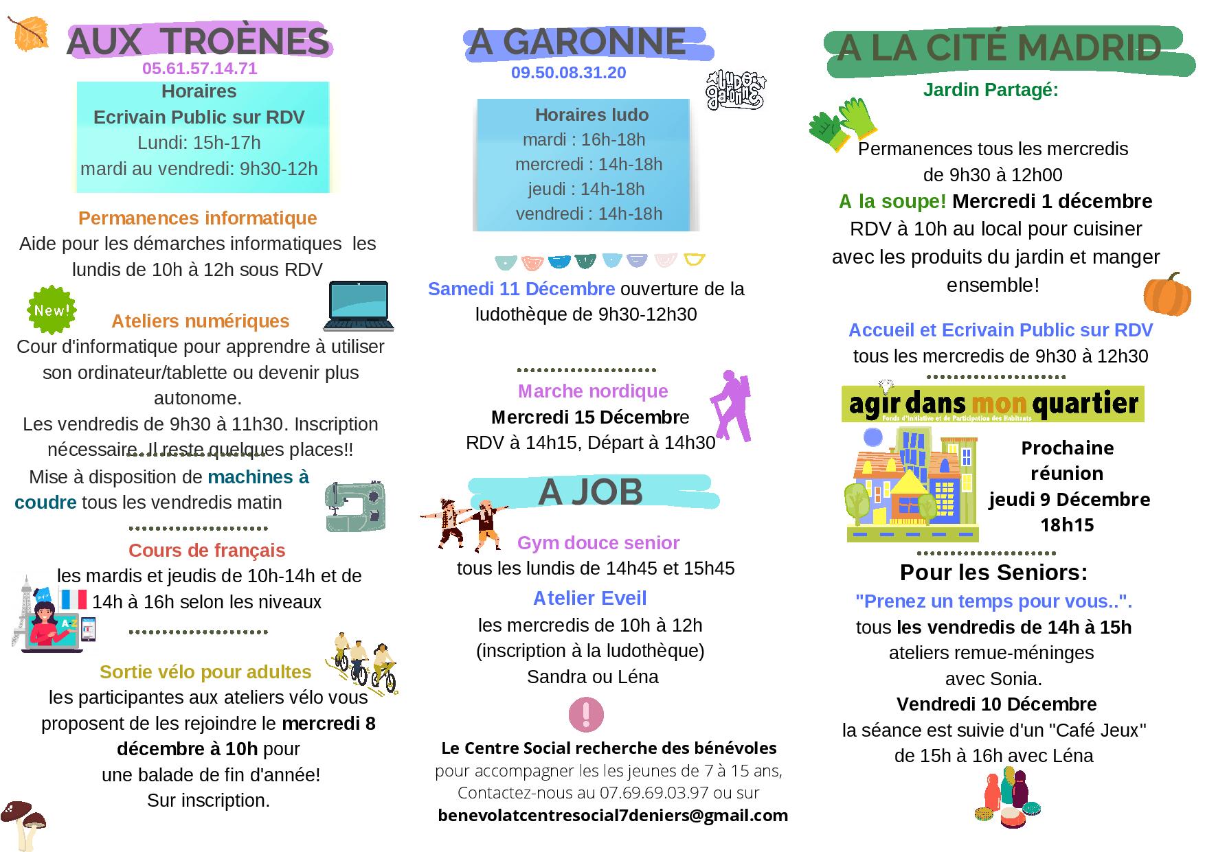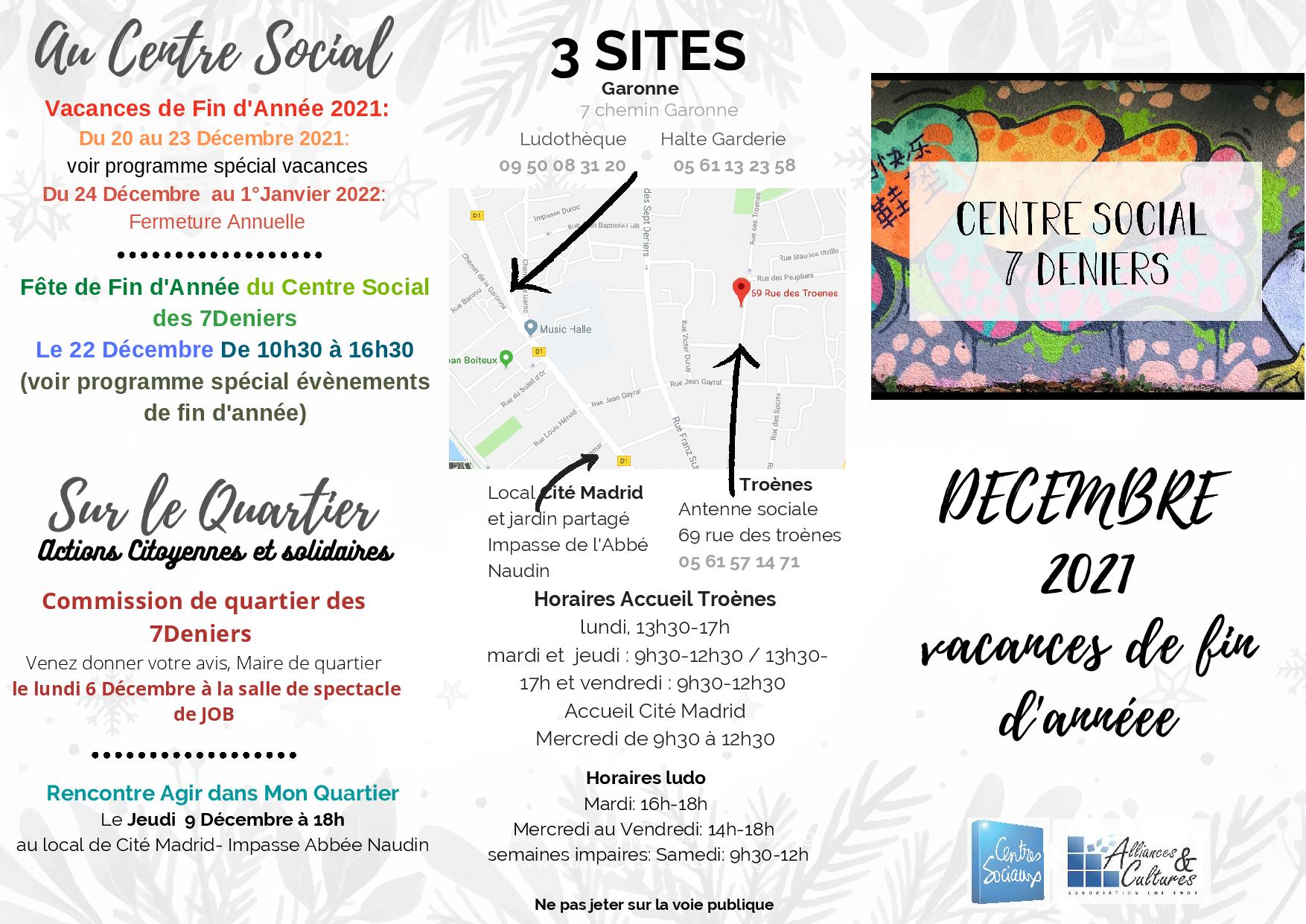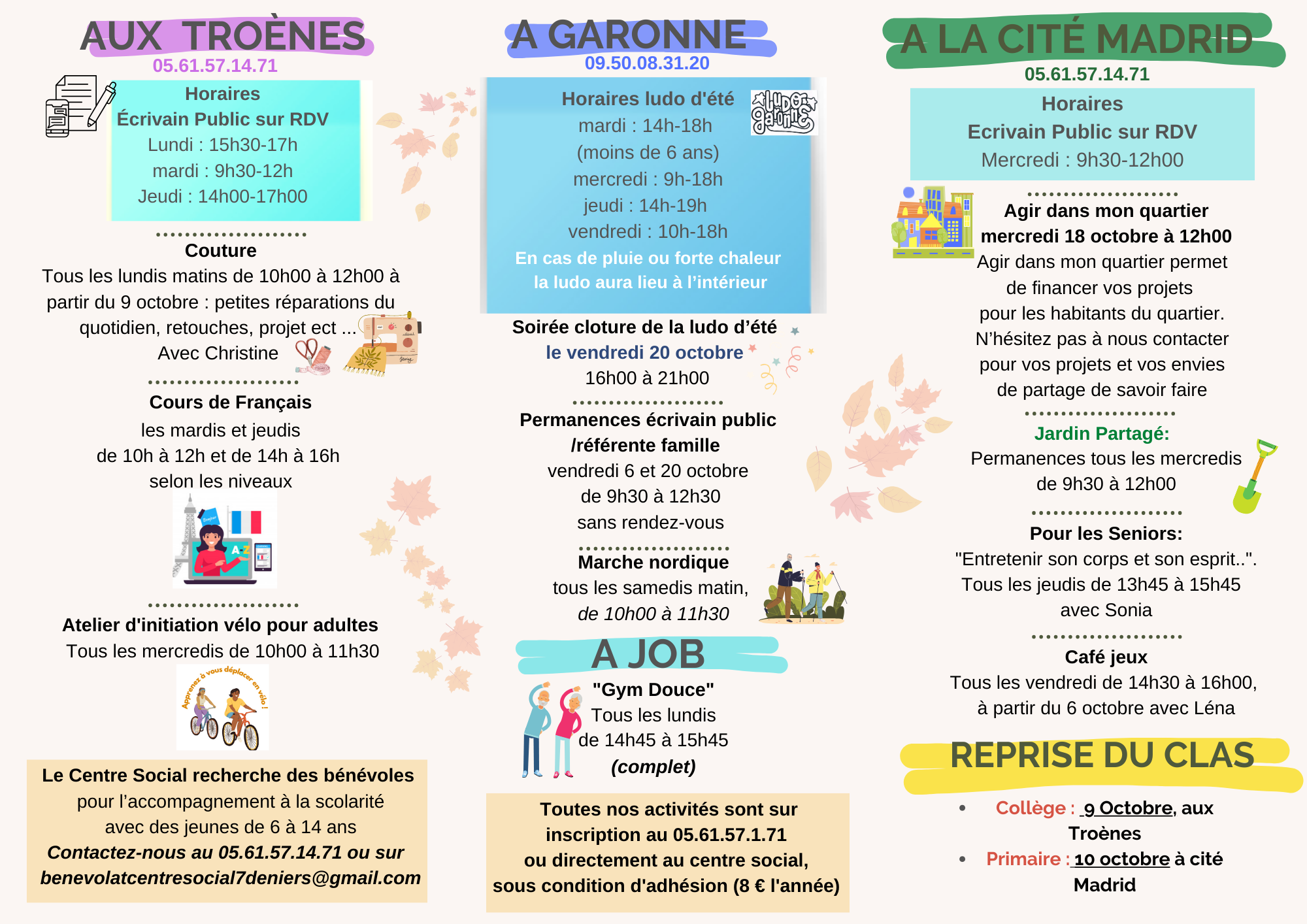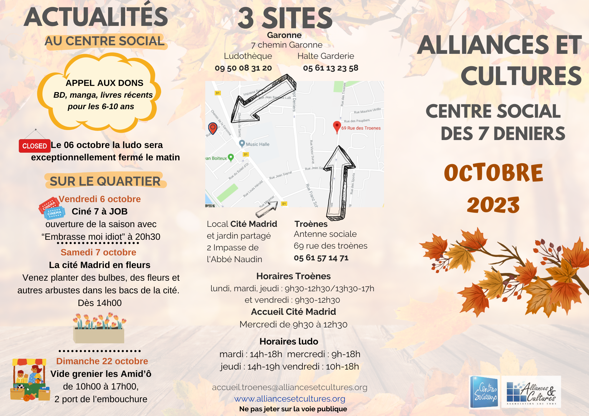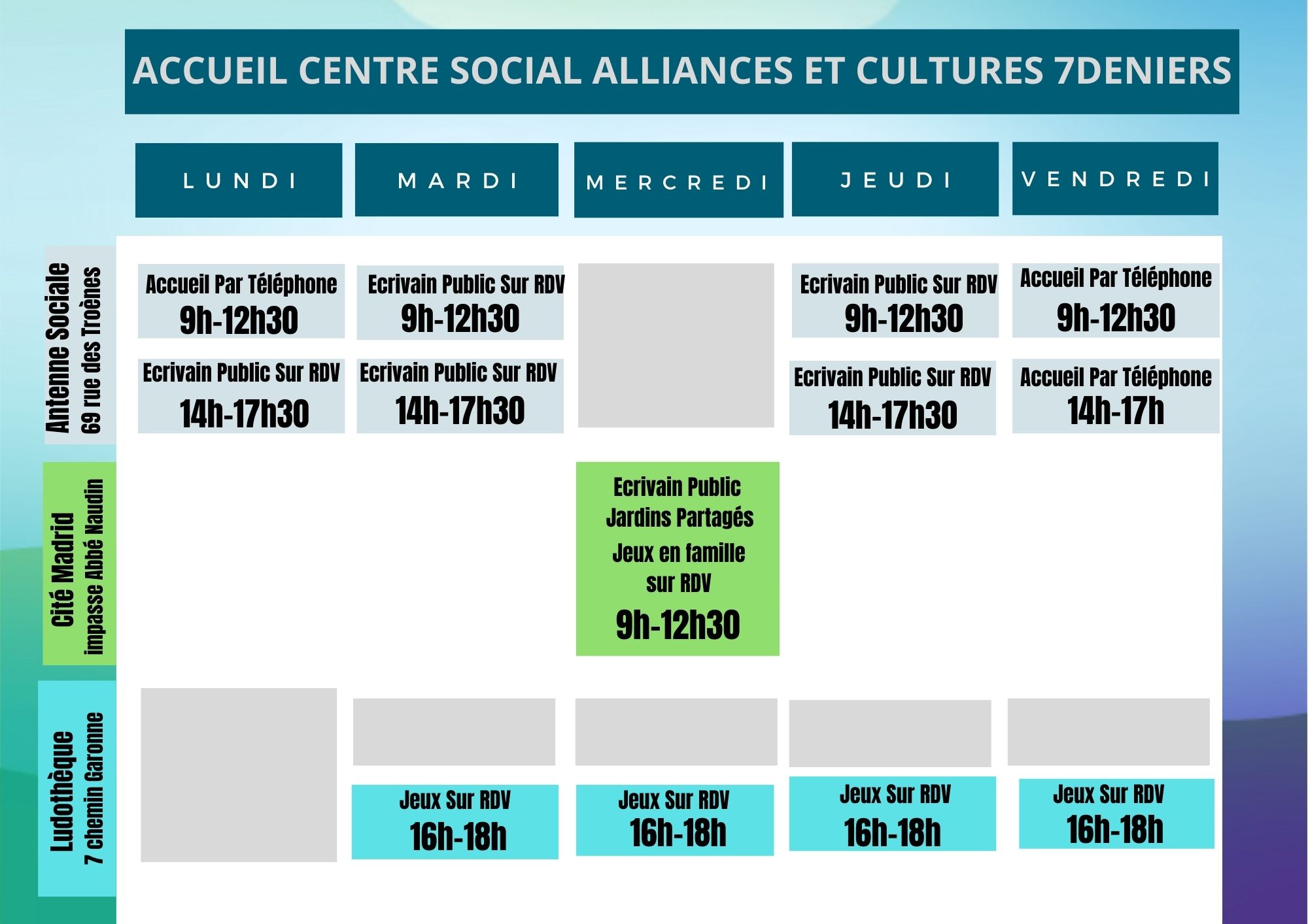 Téléchargez nos programmes d'activités ! Programme juillet 2025Programme ludo d'été 2025 De 3 mois à 17 ans En Famille Pour les adultes Vie de quartier Ludothèque Galerie photos Bienvenue au Centre Social des 7 Deniers Actualités