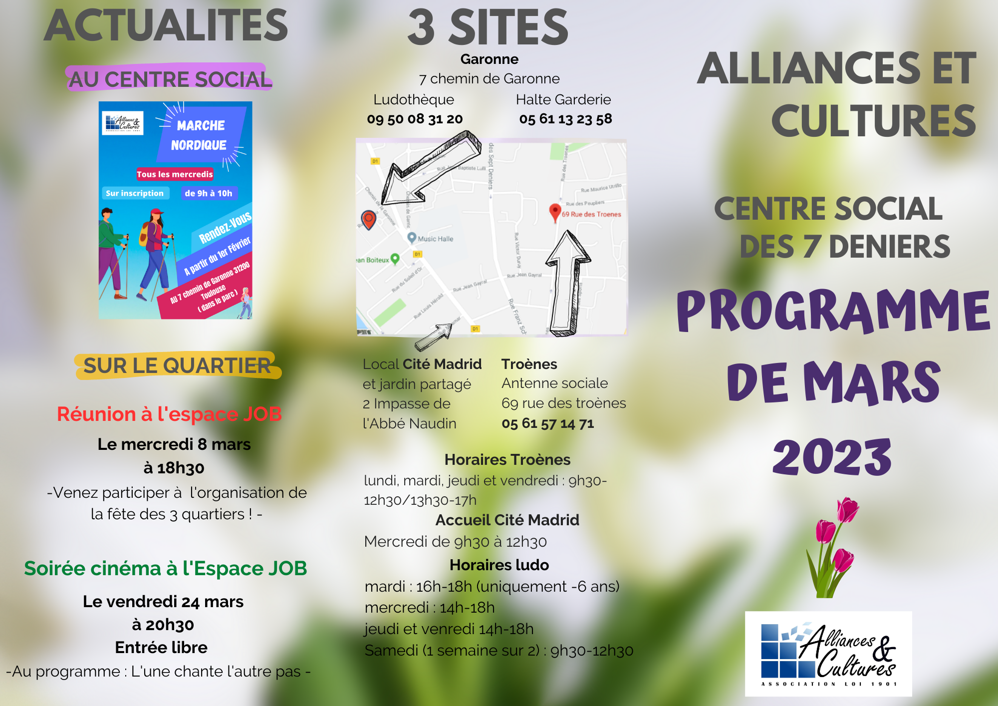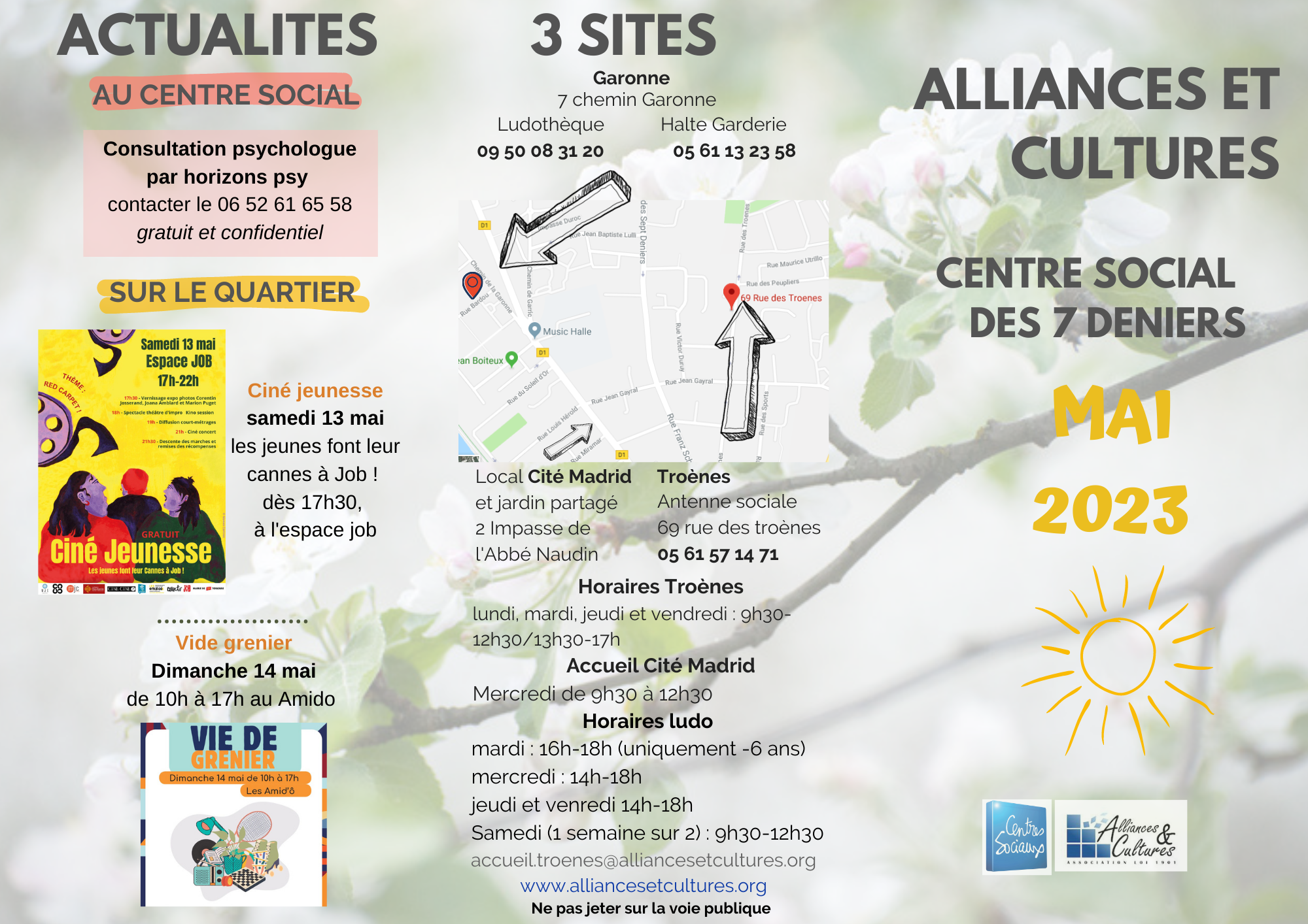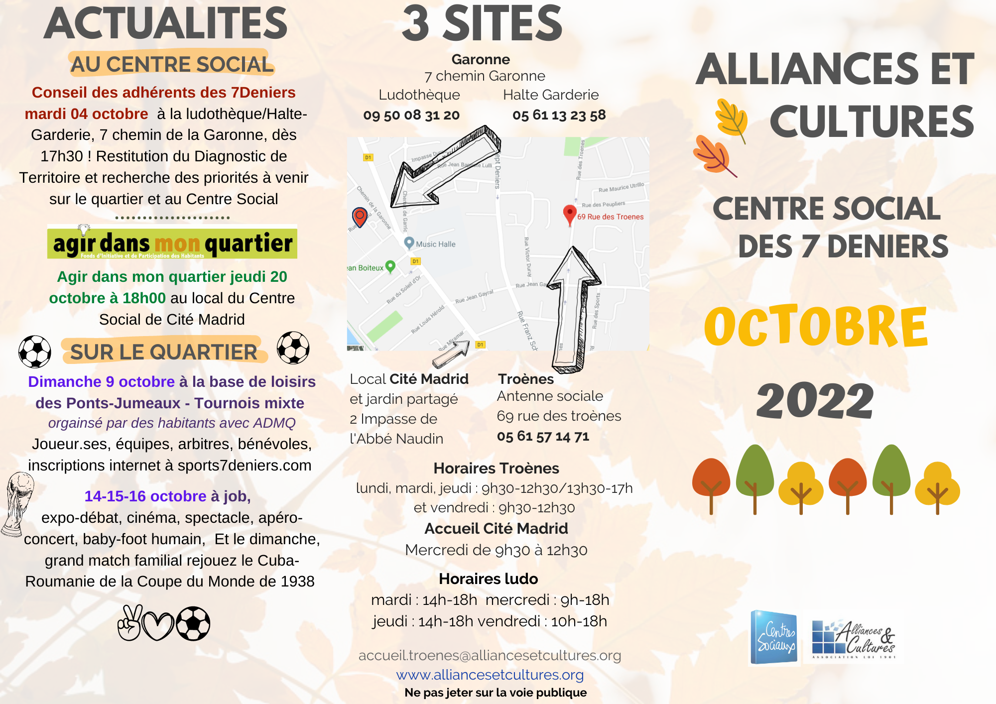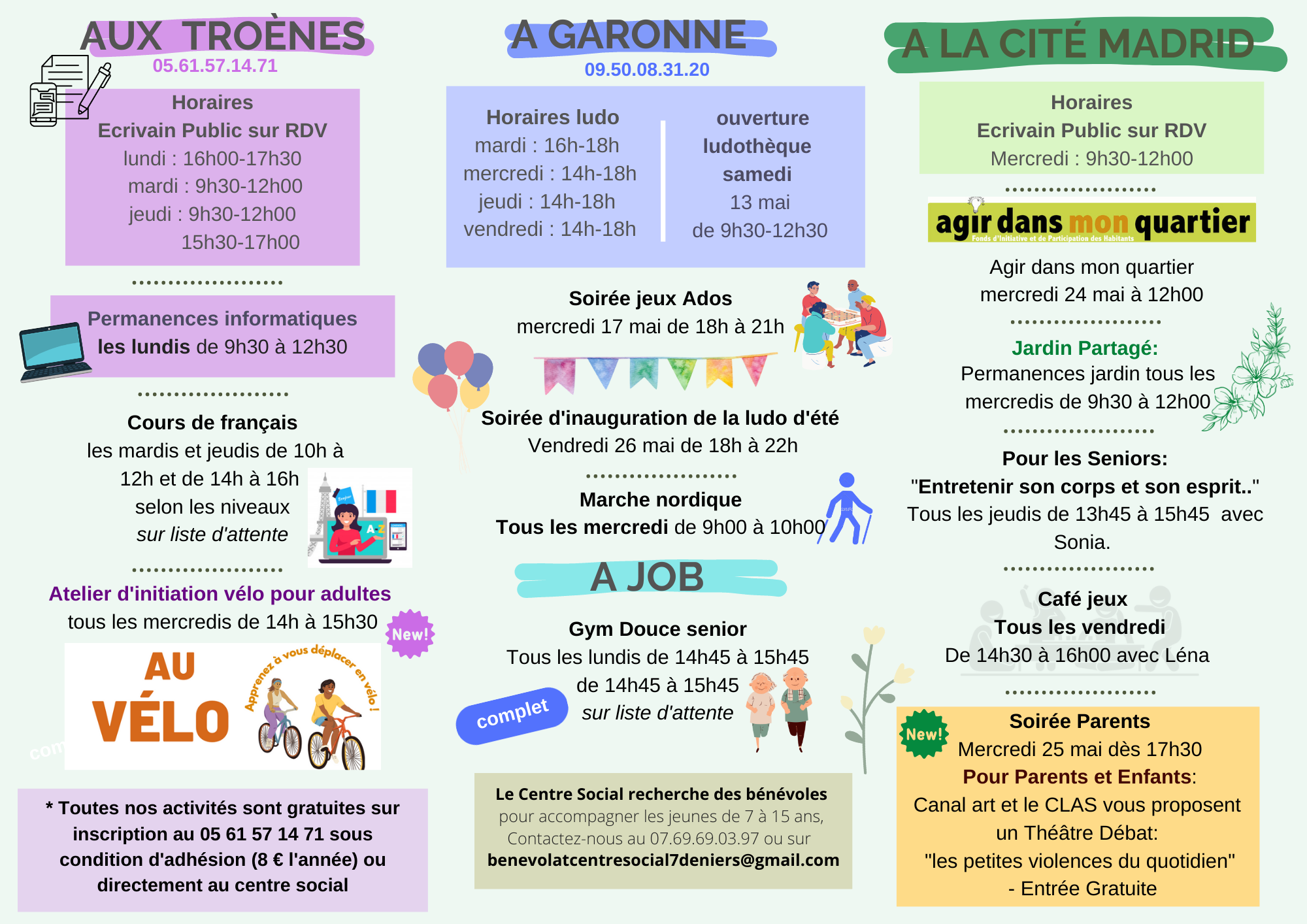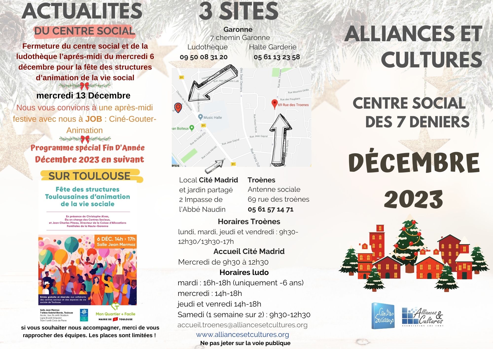Téléchargez nos programmes d'activités ! Programme juillet 2025Programme ludo d'été 2025 De 3 mois à 17 ans En Famille Pour les adultes Vie de quartier Ludothèque Galerie photos Bienvenue au Centre Social des 7 Deniers Actualités