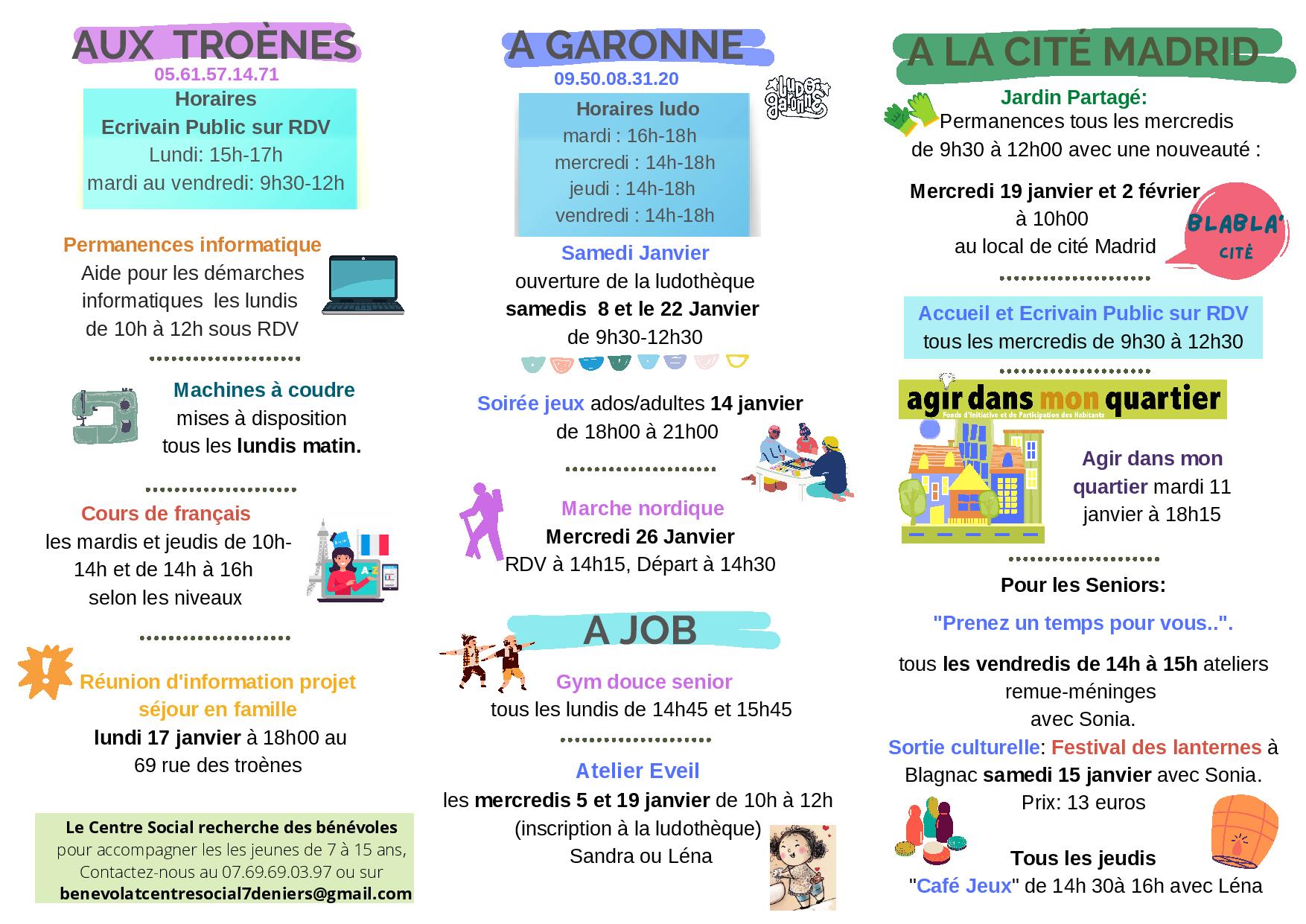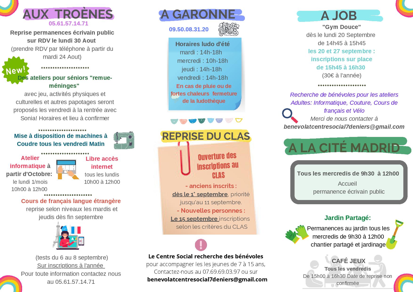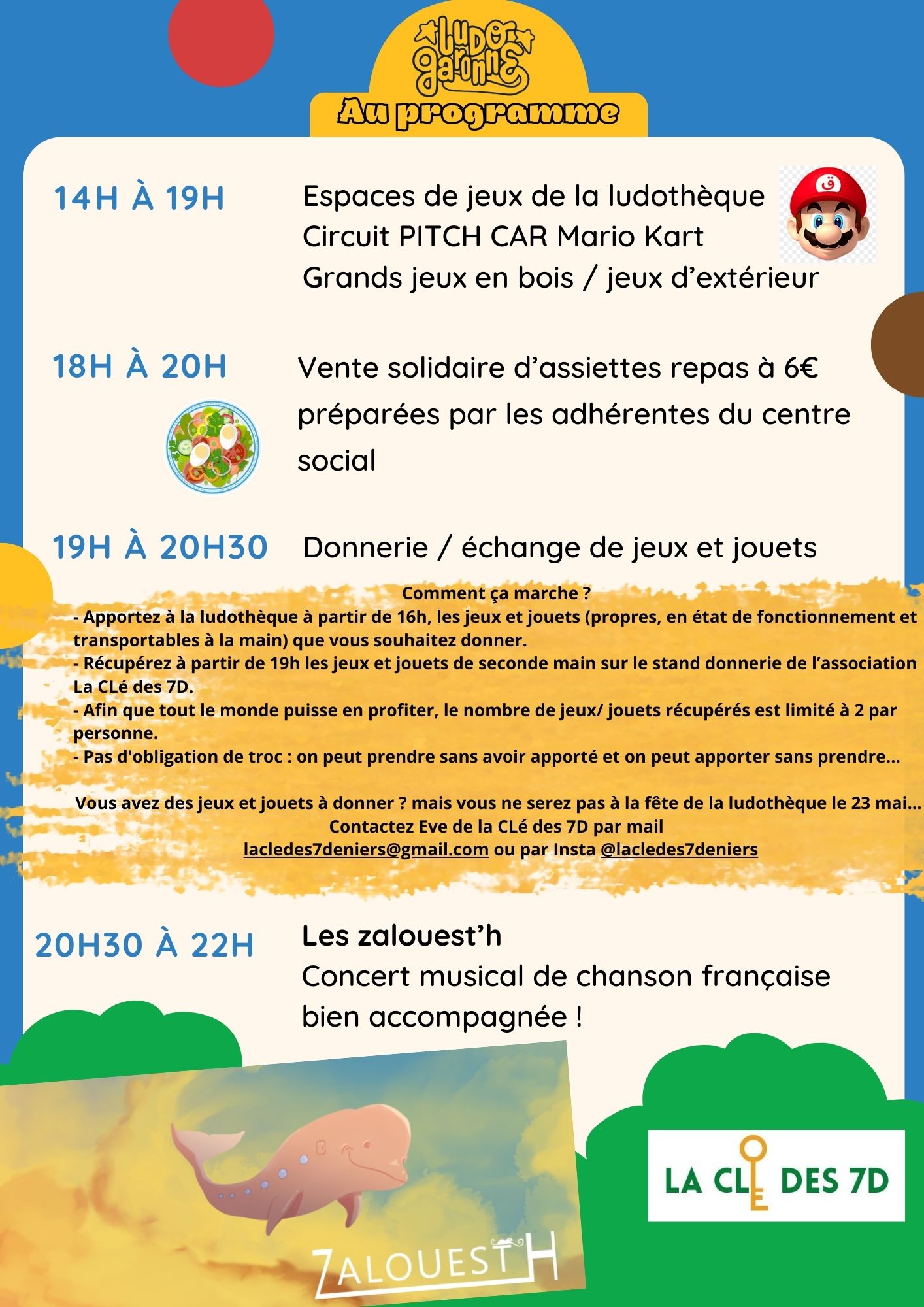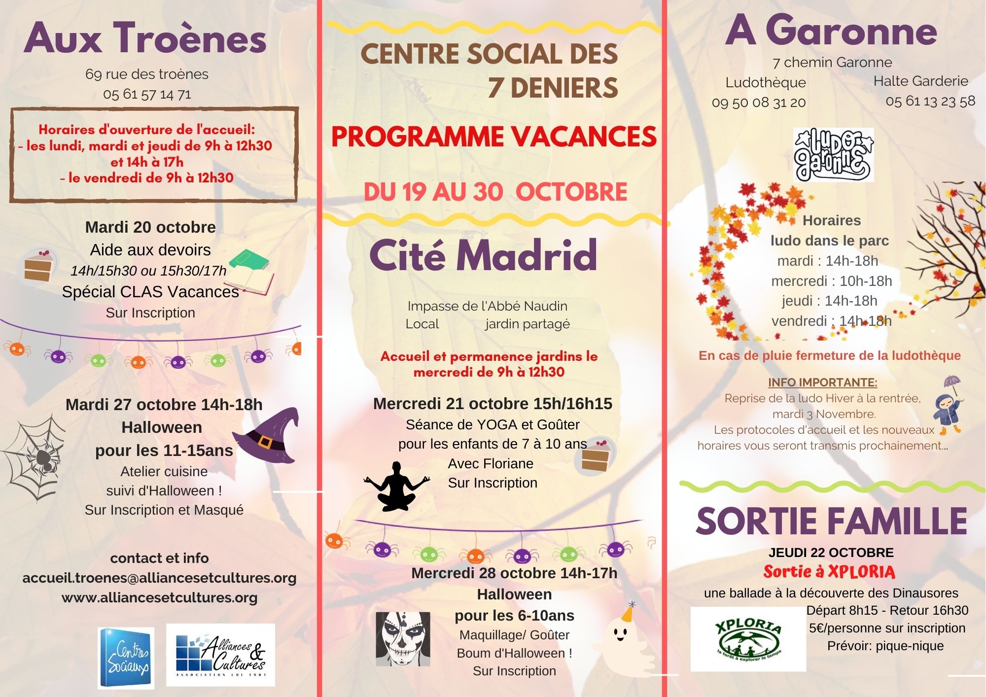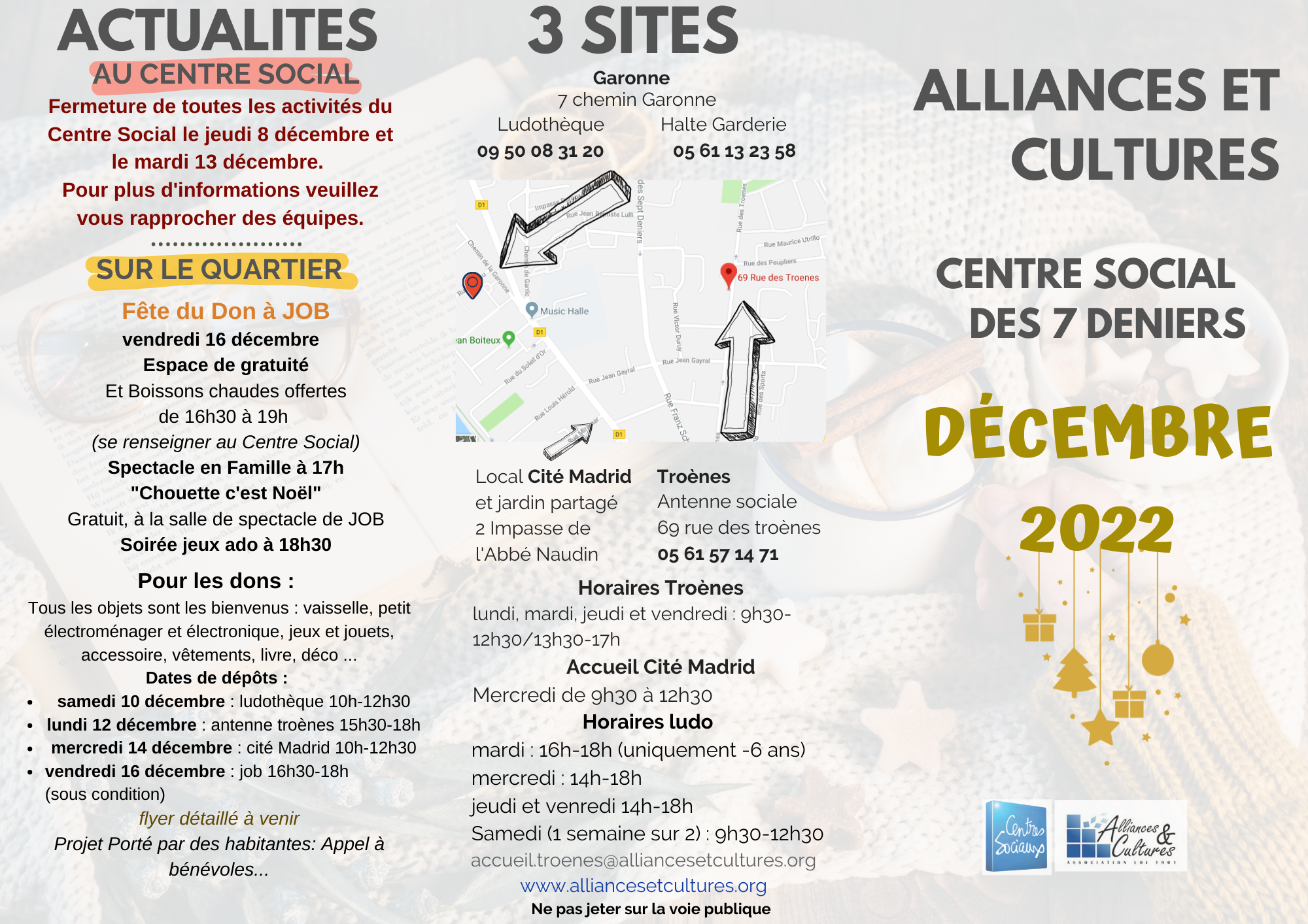 Téléchargez nos programmes d'activités ! Programme juillet 2025Programme ludo d'été 2025 De 3 mois à 17 ans En Famille Pour les adultes Vie de quartier Ludothèque Galerie photos Bienvenue au Centre Social des 7 Deniers Actualités